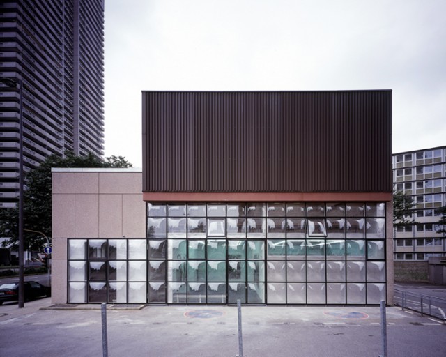 Der in Beton gegossene Baukörper ragt mit seiner Fassade aus gewölbten Glasfenstern auffällig aus dem Stadtbild heraus. Das einstige Umspannwerk wurde 2002 vom Architekten Bernd Kniess umgestaltet und ist heute das Zuhause zweier Kunstgalerien und unserer Studios.
